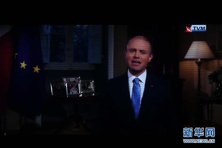 ??? 這是12月1日在馬耳他瓦萊塔拍攝的馬耳他總理穆斯卡特通過國家電視臺發表講話的電視畫面。 新華社發(喬納森·博格攝)