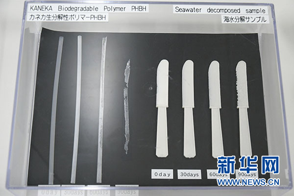 鐘化公司是日本一家知名化學品公司,記者日前前往鐘化公司的大阪總部,參觀了該公司研發的可降解聚合物“PHBH”。據介紹,這種可自然降解聚合物“PHBH”百分之百來源于植物,通過培養攝取植物油的微生物進行生產提取,可用于制造各種塑料制品,“PHBH”在自然界中可被多種微生物分解。鐘化公司還實物展示了“PHBH”塑料制品在海水中自然降解的不同階段,例如一根吸管在海水中90天幾乎可被自然降解殆盡。