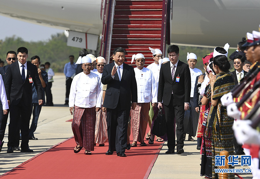習近平抵達時,緬甸第一副總統敏瑞率多名內閣部長在舷梯旁熱情迎接。緬甸少年兒童向習近平獻花。身著各民族傳統服裝的緬甸青年夾道歡迎。禮兵分列紅地毯兩側致意。當地藝術家和大學生們表演具有濃郁民族特色的傳統歌舞。緬甸青少年揮動中緬兩國國旗,用緬文歡呼“中緬友誼萬歲”“習主席身體健康”,向習近平表達最誠摯的歡迎。習近平微笑著向他們揮手致意。