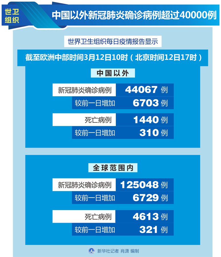 新華社日內瓦3月12日電(記者劉曲)世界衛生組織12日公布的最新數據顯示,中國以外新冠肺炎確診病例超過40000例,達到44067例。