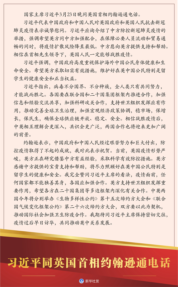習近平指出,病毒不分國界、不分種族,全人類只有共同努力,才能戰(zhàn)而勝之。各國要在聯(lián)合國和二十國集團框架內推進合作,加強信息和經驗交流共享,加強科研攻關合作,支持世衛(wèi)組織發(fā)揮應有作用,推動完善全球衛(wèi)生治理,加強宏觀經濟政策協(xié)調,穩(wěn)市場,保增長,保民生,確保全球供應鏈開放、穩(wěn)定、安全。相信戰(zhàn)勝疫情后,中英相互理解會更深入,共識會更廣泛,兩國合作也將迎來更加廣闊的前景。