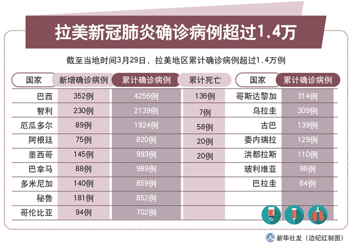 新華社巴西利亞3月29日電 綜合新華社駐拉美地區(qū)記者報(bào)道:拉美地區(qū)新冠肺炎疫情持續(xù)加劇。截至29日,拉美地區(qū)累計(jì)確診病例超過(guò)1.4萬(wàn)例,其中巴西和智利分別超過(guò)4000例和2000例。玻利維亞當(dāng)日?qǐng)?bào)告首例死亡病例。
