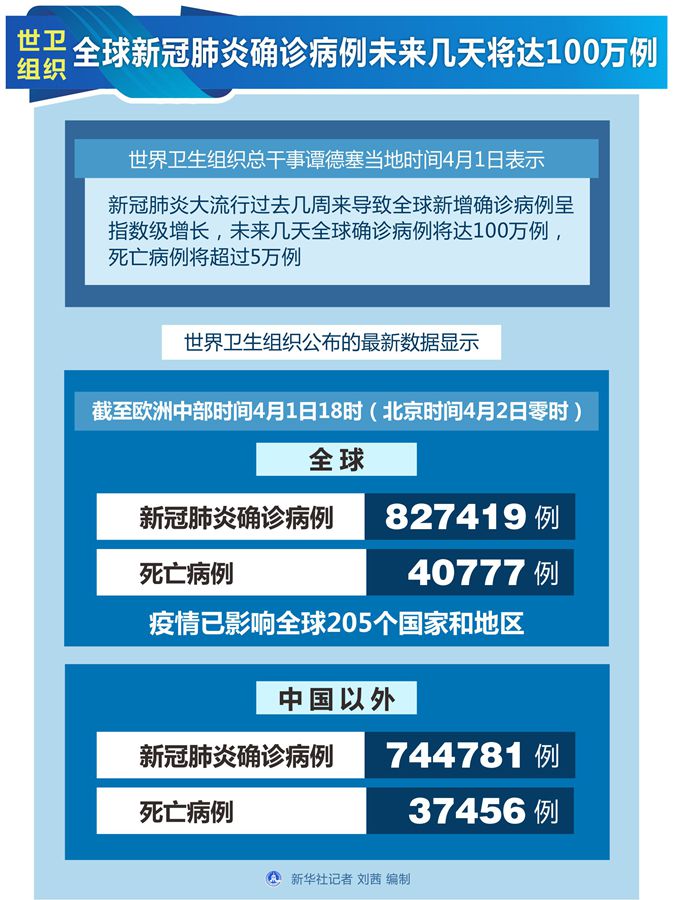 世衛組織發布的最新數據顯示,截至歐洲中部時間1日18時(北京時間2日零時),全球新冠肺炎確診病例升至827419例,死亡病例40777例,疫情已影響到全球205個國家和地區;中國以外新冠肺炎確診病例升至744781例,死亡病例37456例。