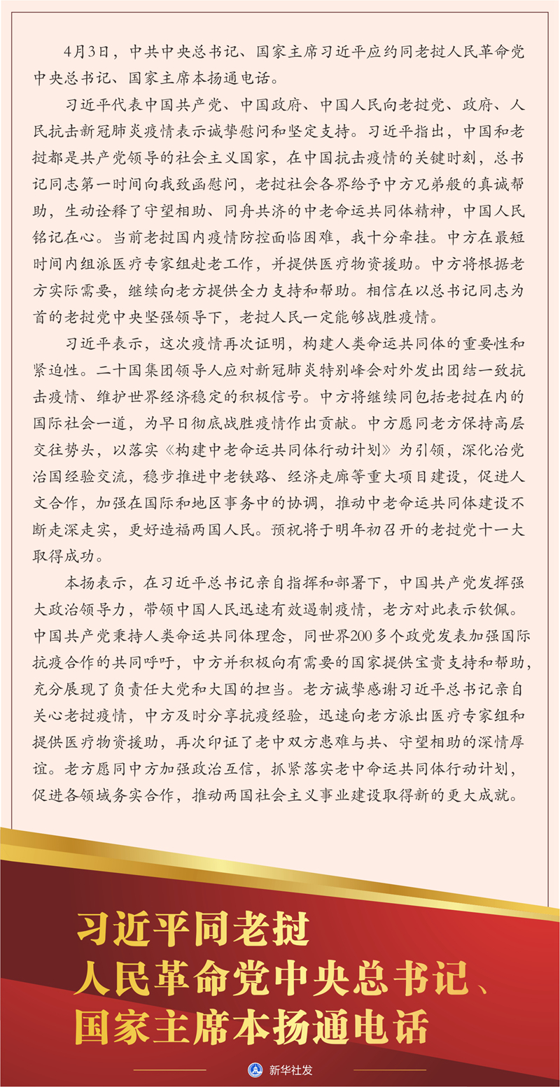 習(xí)近平代表中國共產(chǎn)黨、中國政府、中國人民向老撾黨、政府、人民抗擊新冠肺炎疫情表示誠摯慰問和堅定支持。習(xí)近平指出,中國和老撾都是共產(chǎn)黨領(lǐng)導(dǎo)的社會主義國家,在中國抗擊疫情的關(guān)鍵時刻,總書記同志第一時間向我致函慰問,老撾社會各界給予中方兄弟般的真誠幫助,生動詮釋了守望相助、同舟共濟(jì)的中老命運共同體精神,中國人民銘記在心。當(dāng)前老撾國內(nèi)疫情防控面臨困難,我十分牽掛。中方在最短時間內(nèi)組派醫(yī)療專家組赴老工作,并提供醫(yī)療物資援助。中方將根據(jù)老方實際需要,繼續(xù)向老方提供全力支持和幫助。相信在以總書記同志為首的老撾黨中央堅強(qiáng)領(lǐng)導(dǎo)下,老撾人民一定能夠戰(zhàn)勝疫情。