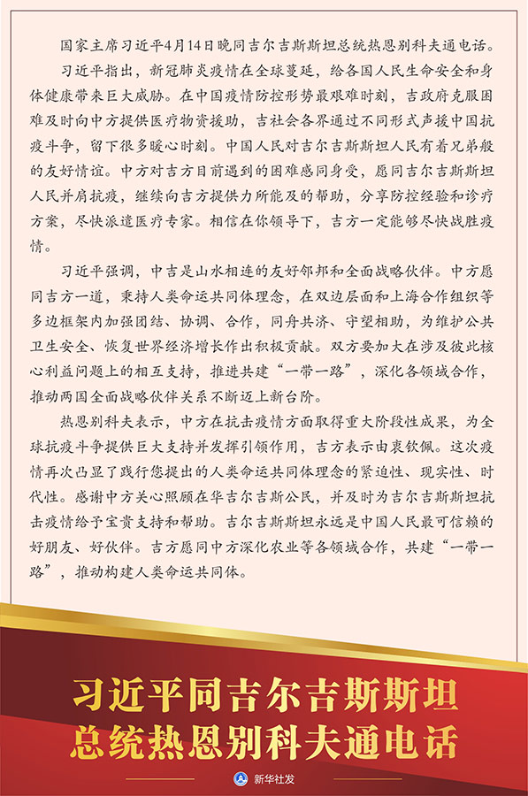 習近平指出,新冠肺炎疫情在全球蔓延,給各國人民生命安全和身體健康帶來巨大威脅。在中國疫情防控形勢最艱難時刻,吉政府克服困難及時向中方提供醫療物資援助,吉社會各界通過不同形式聲援中國抗疫斗爭,留下很多暖心時刻。中國人民對吉爾吉斯斯坦人民有著兄弟般的友好情誼。中方對吉方目前遇到的困難感同身受,愿同吉爾吉斯斯坦人民并肩抗疫,繼續向吉方提供力所能及的幫助,分享防控經驗和診療方案,盡快派遣醫療專家。相信在你領導下,吉方一定能夠盡快戰勝疫情。