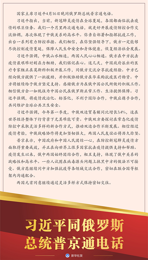 習(xí)近平強(qiáng)調(diào),中俄山水相連,兩國人民心心相通。俄方在中方抗擊疫情最艱難時刻鼎力相助,我們銘記在心。這幾天,中國政府派出的醫(yī)療專家組正在莫斯科積極開展工作,同俄方交流分享抗疫經(jīng)驗(yàn)。中方已經(jīng)向俄方提供了一批援助,并積極協(xié)助俄方在華采購抗疫醫(yī)療物資。中方將繼續(xù)給予俄方堅(jiān)定支持。感謝俄方為在俄中國公民所做的積極工作。相信俄方會一如既往為中國公民在俄羅斯正常工作、生活提供保障。習(xí)近平強(qiáng)調(diào),將疫情政治化、標(biāo)簽化,不利于國際合作,中俄應(yīng)攜手合作,共同維護(hù)全球公共衛(wèi)生安全。