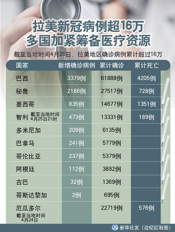 新華社墨西哥城4月26日電 綜合新華社駐拉美地區(qū)記者報(bào)道:新冠疫情在拉美多國持續(xù)蔓延。截至當(dāng)?shù)貢r(shí)間26日,拉美地區(qū)確診病例累計(jì)超過16萬。多國政府為應(yīng)對(duì)疫情,加緊籌備醫(yī)療物資,增派醫(yī)療人員。