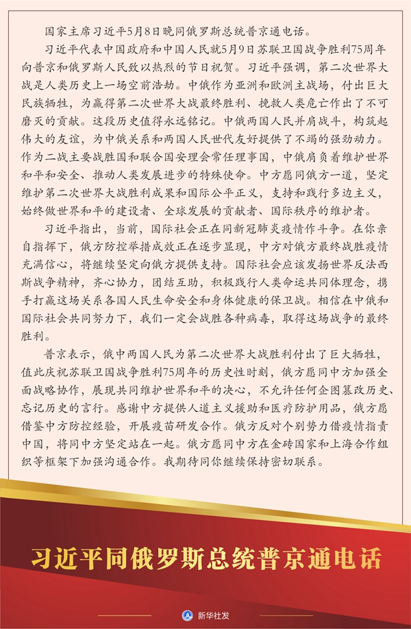 新華社北京5月8日電? 國家主席習近平5月8日晚同俄羅斯總統普京通電話。