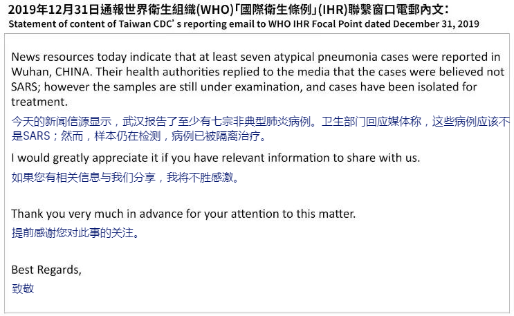 謊言17:臺灣早在2019年12月31日就向世衛組織發出關于新冠肺炎人傳人的警告,但未獲得重視。