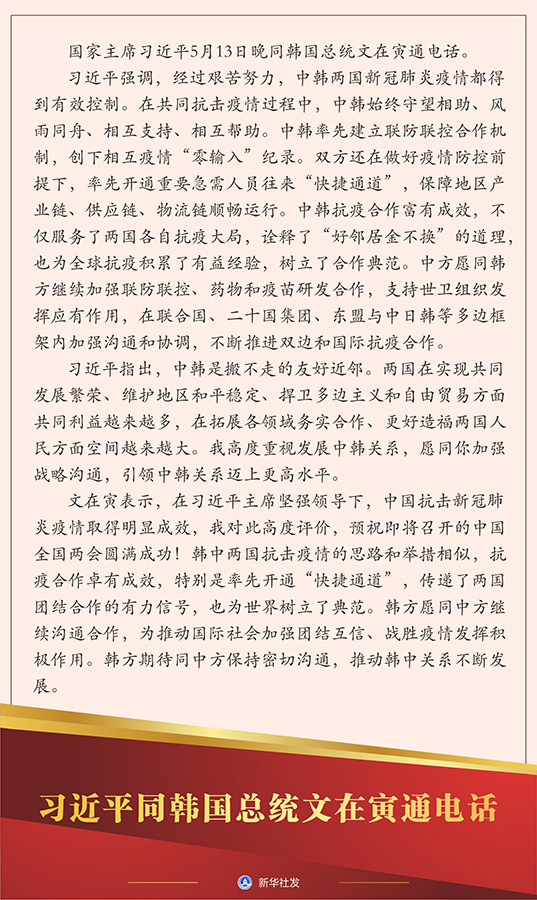 新華社北京5月13日電 國家主席習近平5月13日晚同韓國總統文在寅通電話。