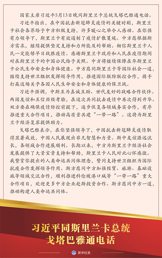 習近平強調,中斯互為真誠互助、世代友好的戰略合作伙伴。兩國友誼和互信歷經考驗,在這次共同抗擊疫情中再次得到升華。雙方要在確保疫情防控前提下,逐步恢復各領域務實合作,有序推進重大合作項目,推動高質量共建“一帶一路”。這將為斯里蘭卡經濟復蘇提供助力。