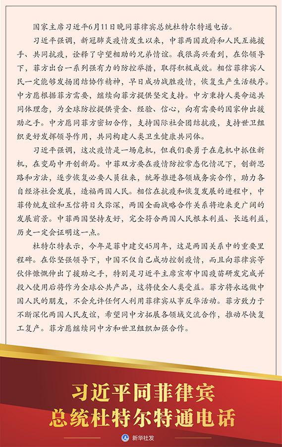 新華社北京6月11日電 國家主席習近平6月11日晚同菲律賓總統(tǒng)杜特爾特通電話。