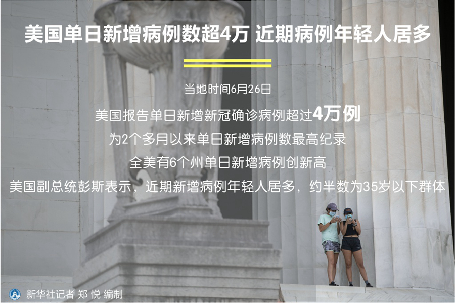 新華社華盛頓6月26日電(記者譚晶晶)美國26日報(bào)告單日新增新冠確診病例超過4萬例,為2個(gè)多月以來單日新增病例數(shù)最高紀(jì)錄。全美有6個(gè)州單日新增病例創(chuàng)新高。美國副總統(tǒng)彭斯表示,近期新增病例年輕人居多,約半數(shù)為35歲以下群體。
