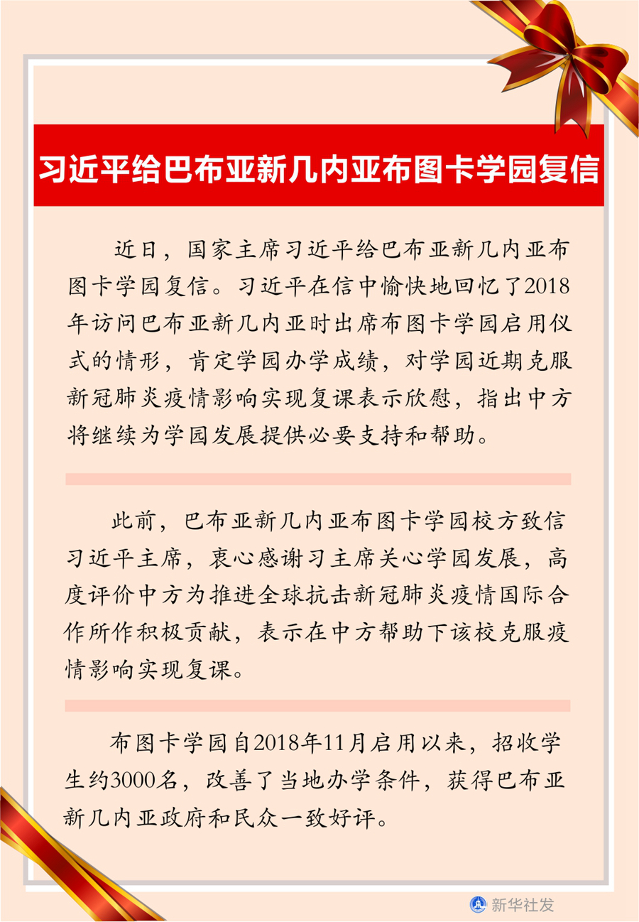 此前,巴布亞新幾內(nèi)亞布圖卡學園校方致信習近平主席,衷心感謝習主席關(guān)心學園發(fā)展,高度評價中方為推進全球抗擊新冠肺炎疫情國際合作所作積極貢獻,表示在中方幫助下該校克服疫情影響實現(xiàn)復課。