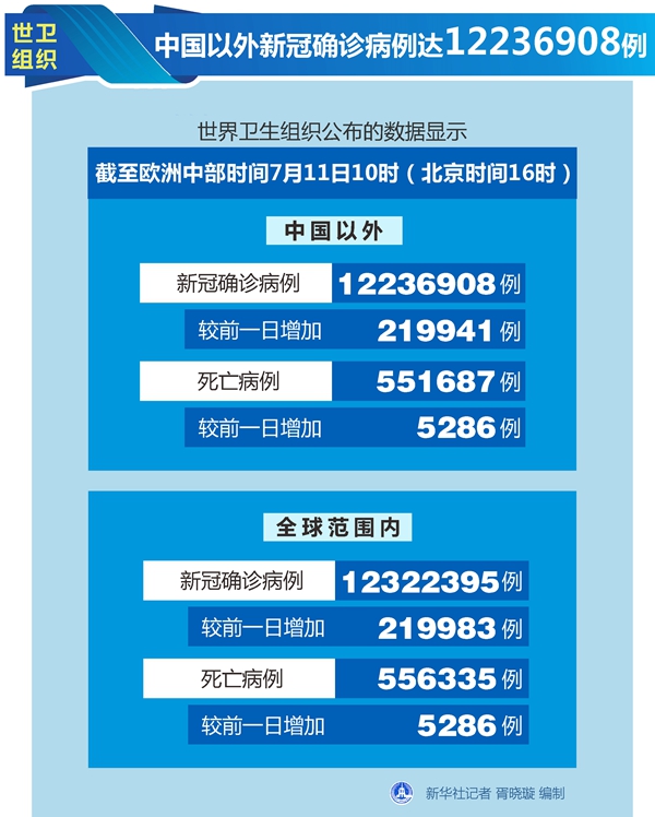 世衛組織每日疫情報告顯示,截至歐洲中部時間11日10時(北京時間16時),中國以外新冠確診病例較前一日增加219941例,達到12236908例;中國以外死亡病例較前一日增加5286例,達到551687例。