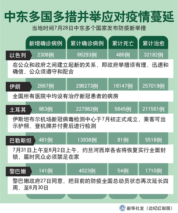 新華社突尼斯7月29日電 綜合新華社駐中東地區(qū)記者報道:為進一步應(yīng)對中東多國持續(xù)蔓延的新冠疫情,同時防止因宰牲節(jié)人群聚集加劇疫情擴散,中東多個國家28日發(fā)布防疫新舉措。