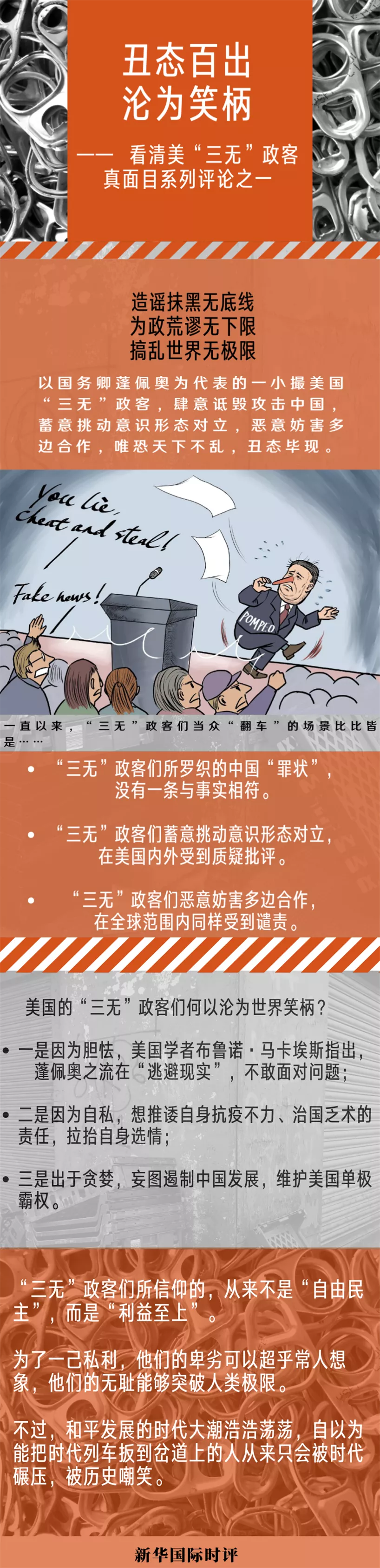 一段時間以來,以國務卿蓬佩奧為代表的一小撮造謠抹黑無底線、為政荒謬無下限、搞亂世界無極限的美國“三無”政客,肆意詆毀攻擊中國,蓄意挑動意識形態對立,惡意妨害多邊合作,唯恐天下不亂,丑態畢現。