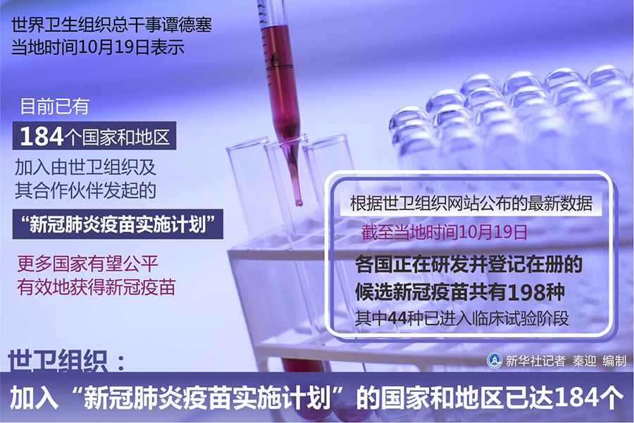 新華社日內(nèi)瓦10月19日電(記者聶曉陽(yáng) 陳俊俠)世界衛(wèi)生組織總干事譚德塞19日表示,目前已有184個(gè)國(guó)家和地區(qū)加入由世衛(wèi)組織及其合作伙伴發(fā)起的“新冠肺炎疫苗實(shí)施計(jì)劃”,更多國(guó)家有望公平有效地獲得新冠疫苗。