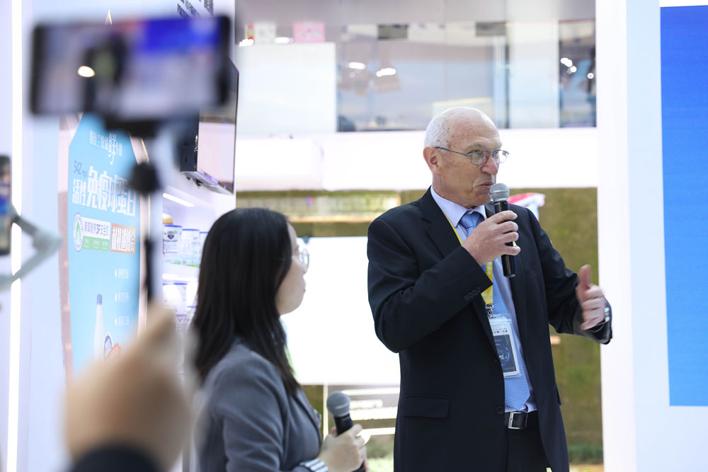 11月7日,羅伊在進博會場館內為合作伙伴介紹產品。
