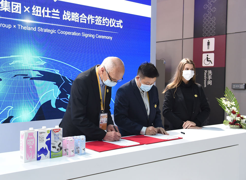 11月5日,羅伊(左一)在進博會上的紐仕蘭乳業展臺參加簽約儀式。