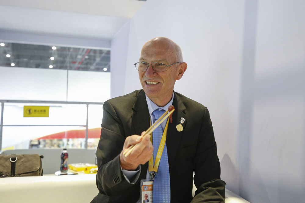 11月7日,午休時,羅伊在第三屆進博會紐仕蘭乳業展臺使用筷子吃飯。