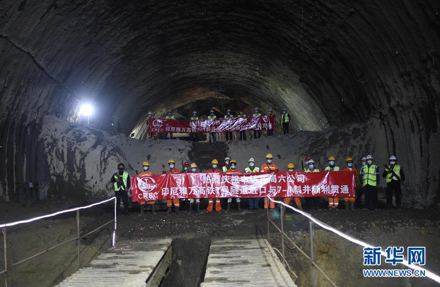 11月15日,施工人員在印度尼西亞西爪哇省慶祝雅萬高鐵7號(hào)隧道貫通。新華社發(fā)(祖卡南 攝)