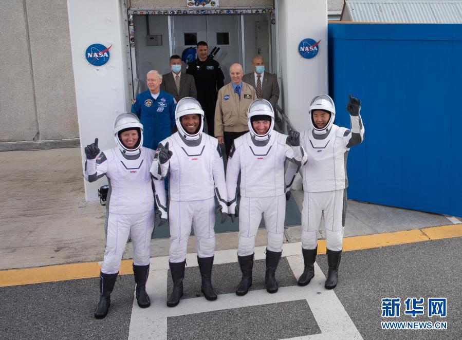 這是11月15日在美國佛羅里達州肯尼迪航天中心拍攝的參與這次代號“Crew-1”航天任務的宇航員香農·沃克,維克托·格洛韋爾,邁克爾·霍普金斯,和日本宇宙航空研究開發機構的宇航員野口聰一(從左至右)。 新華社發(美國航天局供圖)