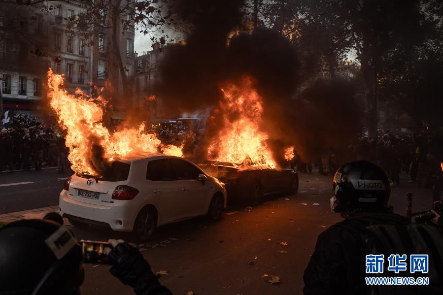 這是11月28日在法國巴黎拍攝的游行示威中被點燃的車輛。