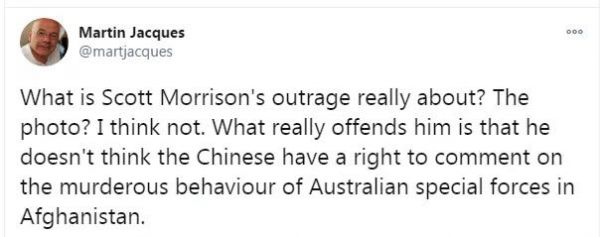 “莫里森的憤怒到底是什么?‘照片’?我想不是。真正令他惱怒的是,他認(rèn)為中國人無權(quán)對(duì)澳大利亞特種部隊(duì)在阿富汗的謀殺行為發(fā)表評(píng)論。”