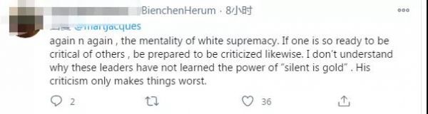 “又一次,白人至上的心態(tài)。如果一個(gè)人準(zhǔn)備好批評(píng)別人,也要準(zhǔn)備好同樣地被批評(píng)。我不明白為什么這些領(lǐng)導(dǎo)人沒有學(xué)會(huì)‘沉默就是金子’的力量。他的批評(píng)只會(huì)讓事情變得更糟。”
