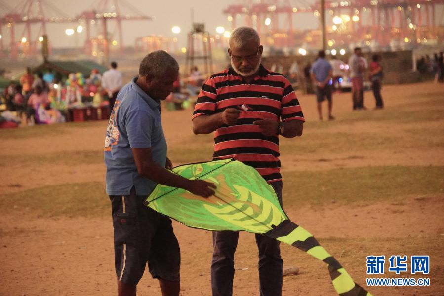 這張拍攝于2019年1月10日的資料照片顯示,納瓦在斯里蘭卡首都科倫坡加勒菲斯綠地廣場上調整風箏。新華社記者 唐璐 攝