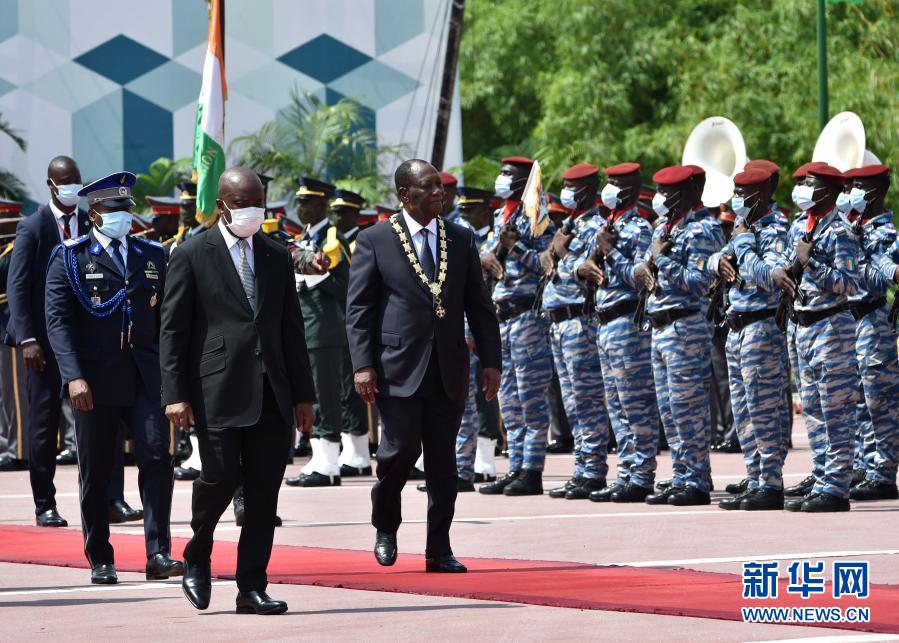 12月14日,在科特迪瓦阿比讓,瓦塔拉(前右)宣誓就職后參加檢閱儀式。新華社發(伊萬·宋攝)