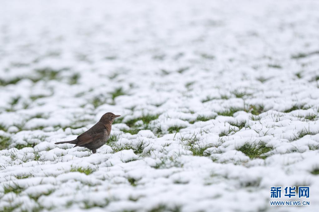 4月7日,一只鳥在比利時(shí)布魯塞爾五十周年紀(jì)念公園積雪的草地上覓食。