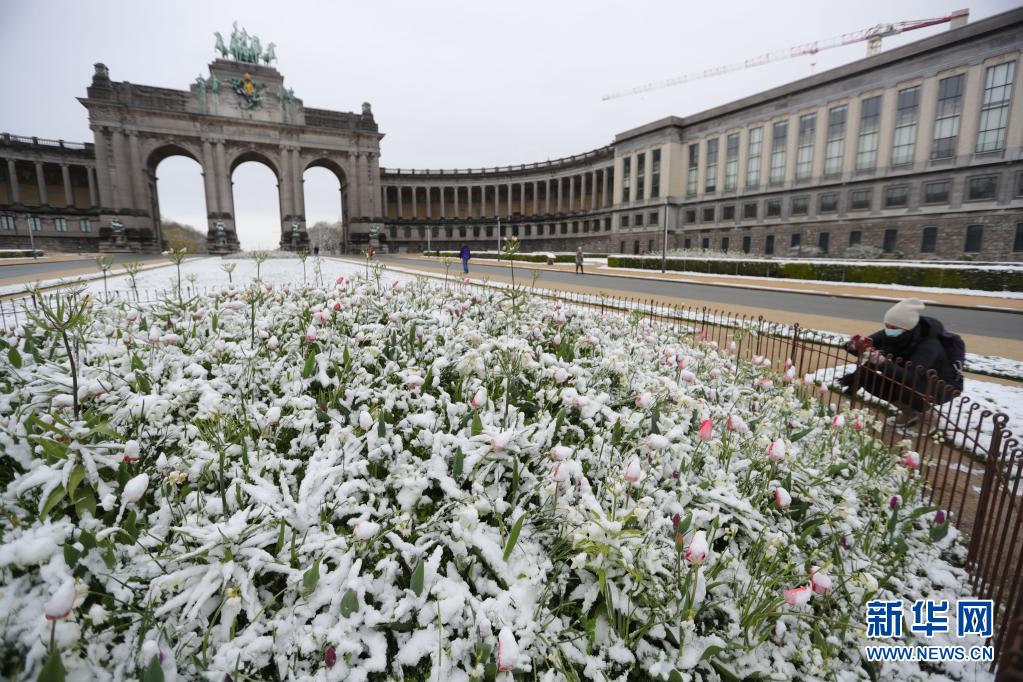 比利時近日迎來春雪,首都布魯塞爾銀裝素裹,景色別致。