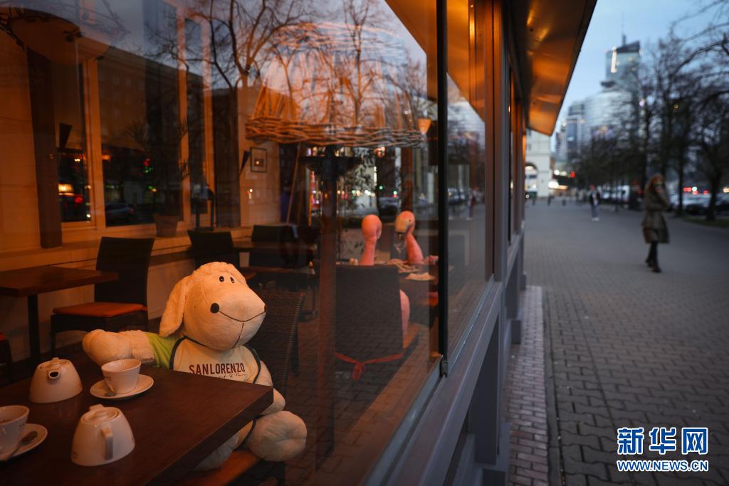 4月13日,波蘭首都華沙一家餐館將動物玩偶擺放在靠窗座位上吸引顧客。