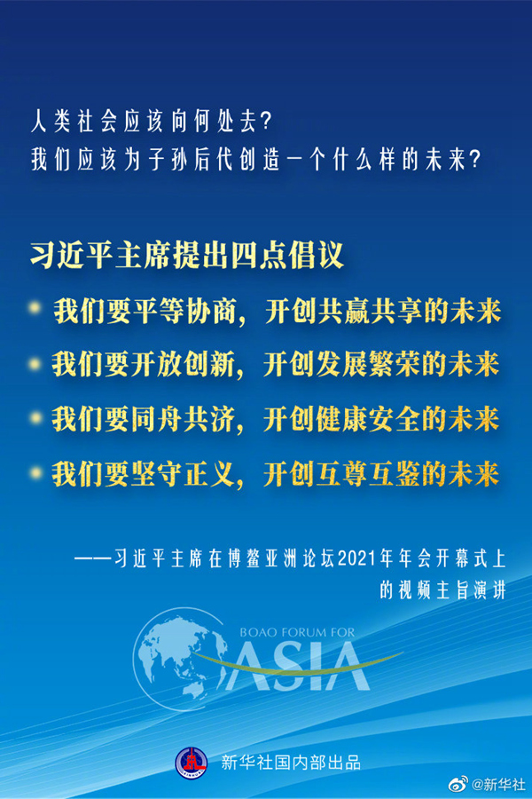 博鰲亞洲論壇2021年年會開幕式20日上午在海南博鰲舉行,國家主席習近平以視頻方式發表主旨演講。面對“人類社會應該向何處去?我們應該為子孫后代創造一個什么樣的未來?”這一重大命題,習近平主席提出四點倡議。