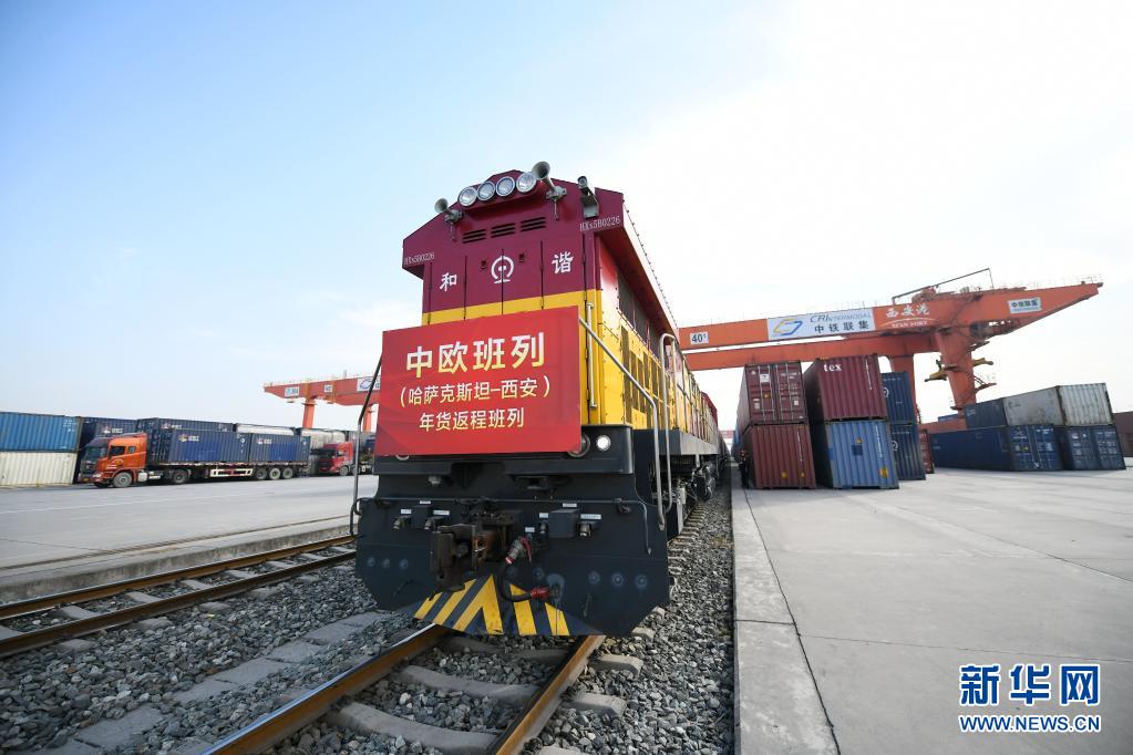 2月3日,滿載年貨的中歐班列抵達中國鐵路西安局集團有限公司新筑車站。新華社記者 李一博 攝