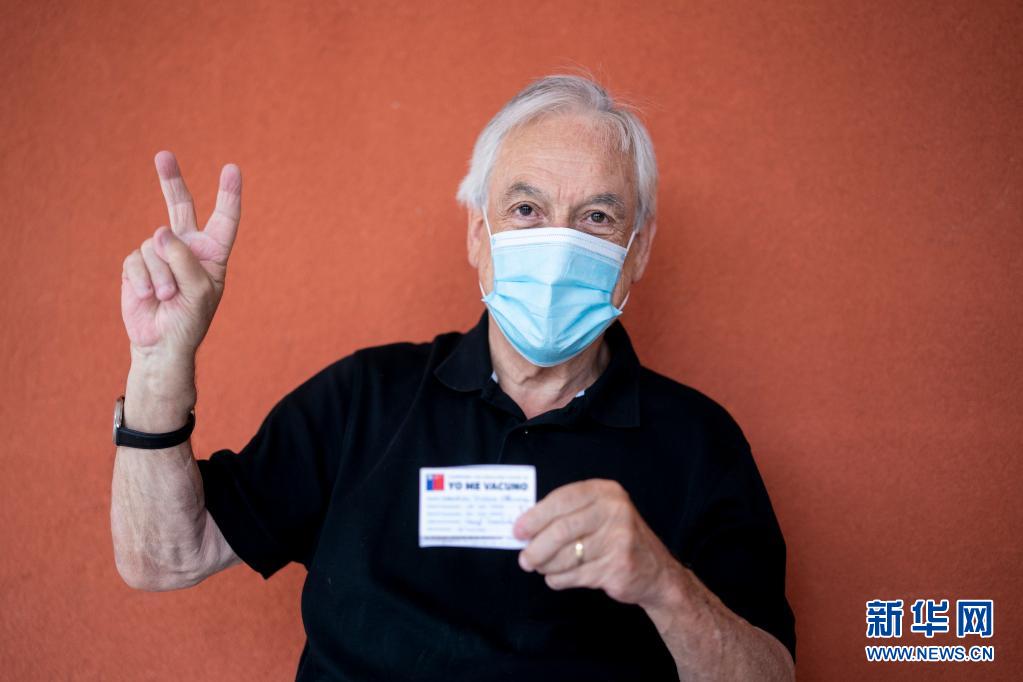 2月12日,在智利南部河大區福德羅諾市的一處社區家庭保健中心,智利總統皮涅拉接種中國疫苗后比出“V”的手勢。新華社發