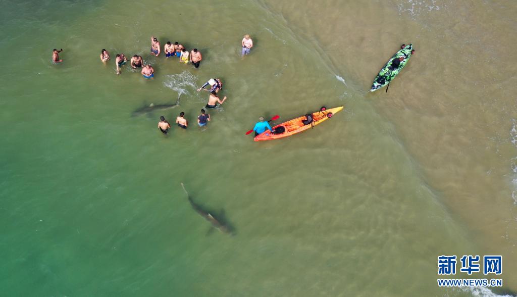 4月20日,在以色列北部城市哈代拉的海邊,鯊魚從人們身邊游過(無人機照片)。