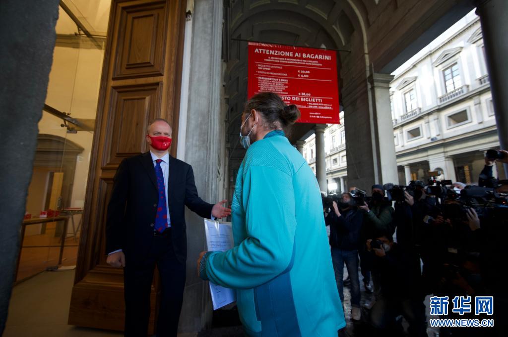 5月4日,在意大利佛羅倫薩,烏菲齊美術館館長施密特(左)在重新開放的美術館門口迎接參觀者。當日,意大利烏菲齊美術館重新開放。美術館改建了售票處和接待處,以避免排隊,并開設了十四個新展室。新華社發