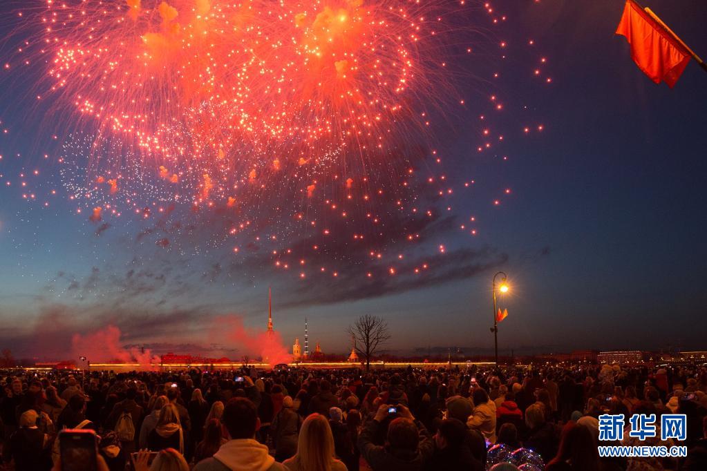 當(dāng)日,俄羅斯圣彼得堡燃放煙花,紀(jì)念衛(wèi)國戰(zhàn)爭勝利76周年。