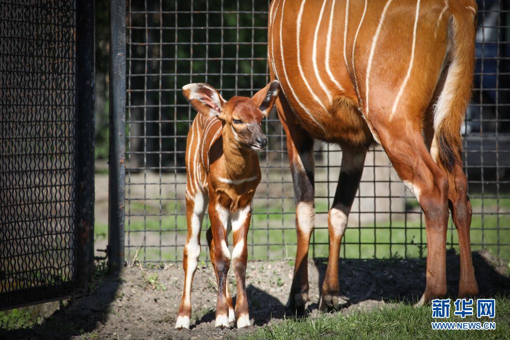 5月10日,兩周大的幼年山地紫羚與母親一起在波蘭首都華沙的華沙動物園的籠舍中散步。