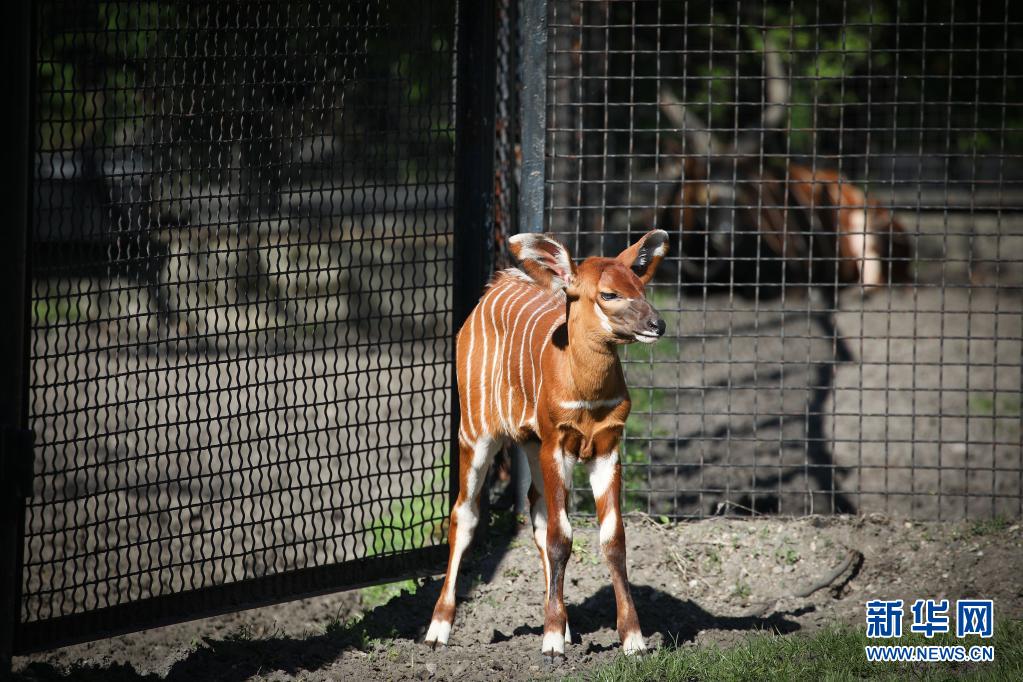 5月10日,兩周大的幼年山地紫羚在波蘭首都華沙的華沙動物園的籠舍中散步。