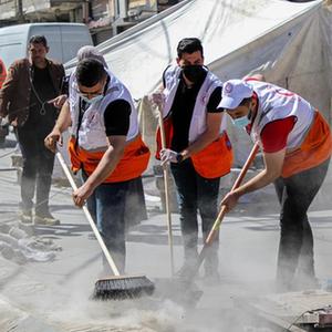 5月23日,巴勒斯坦志愿者在加沙城一處遭到以色列轟炸的地點清理廢墟。