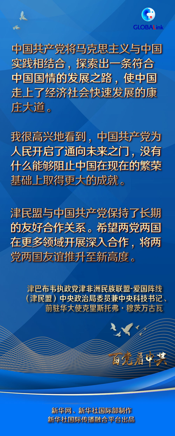“我很高興地看到,中國共產黨為人民開啟了通向未來之門,沒有什么能夠阻止中國在現在的繁榮基礎上取得更大的成就。”穆茨萬古瓦說,津民盟和他本人對中國共產黨帶領中國人民所取得的偉大成就表示贊嘆,祝愿中國在未來取得更大的發展成就。他希望兩黨兩國在更多領域開展深入合作,將兩黨兩國友誼推升至新高度。