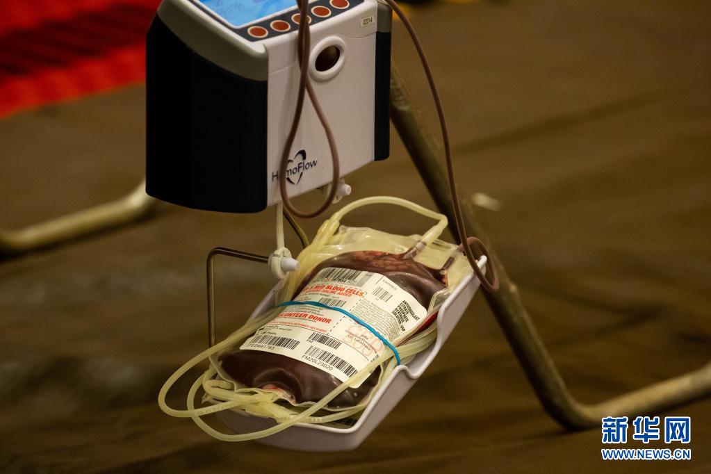 這是6月14日在美國紐約州長島地區的尤寧代爾拍攝的獻血志愿者在美國紐約血液中心舉行的獻血活動上捐獻的血液。