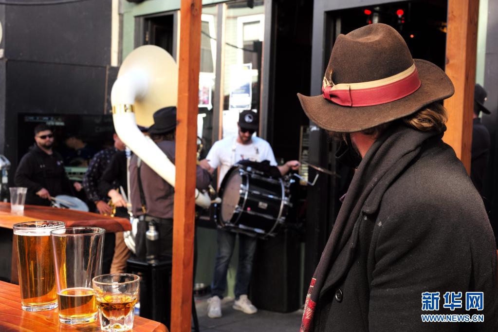 6月15日,一支樂隊(duì)在美國加利福尼亞州舊金山一家酒吧外演奏。