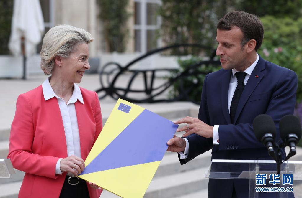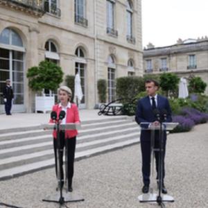 6月23日,法國(guó)總統(tǒng)馬克龍(右)與歐盟委員會(huì)主席馮德萊恩在巴黎總統(tǒng)府愛(ài)麗舍宮出席新聞發(fā)布會(huì)。