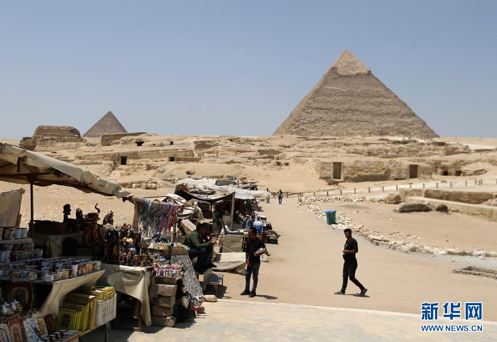 這是4月26日拍攝的位于埃及吉薩省金字塔群景區(qū)的攤位。